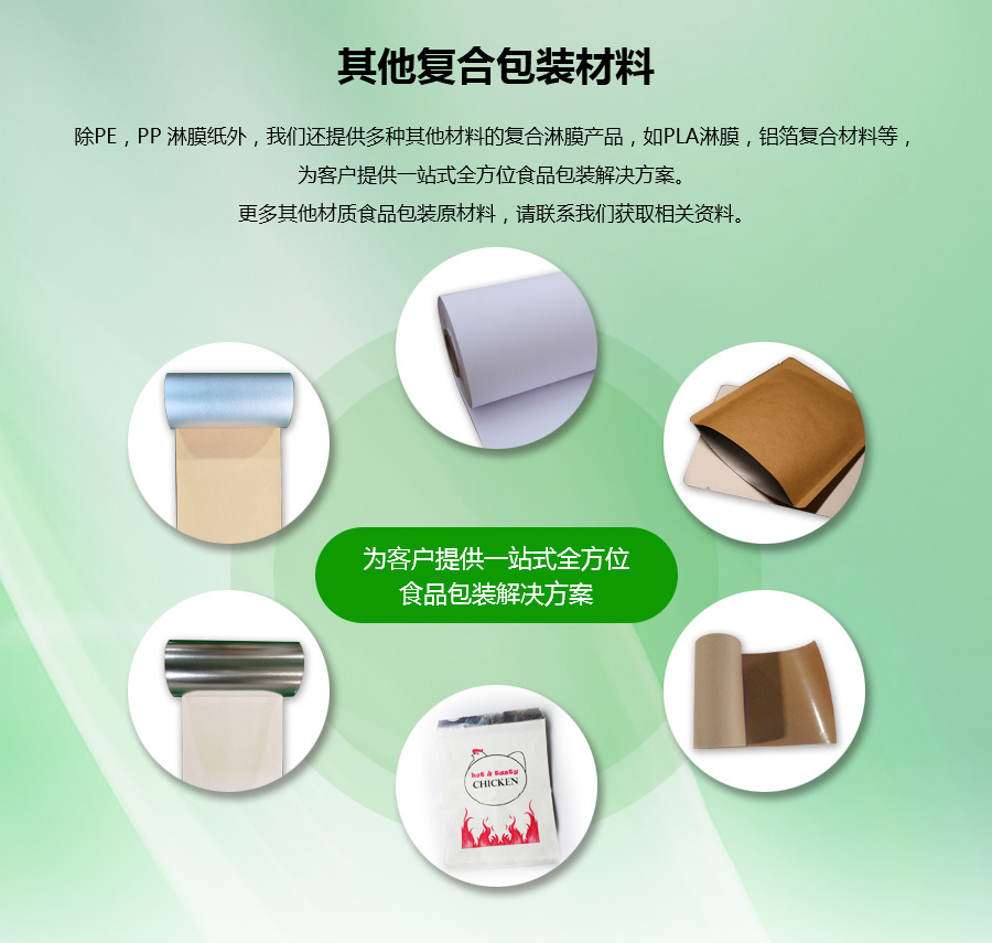 我们还提供多种其他材料的复合淋膜产品,如PLA淋膜、铝箔复合材料、其他纸类复合材料,提供一站式全方位食品包装解决方案。